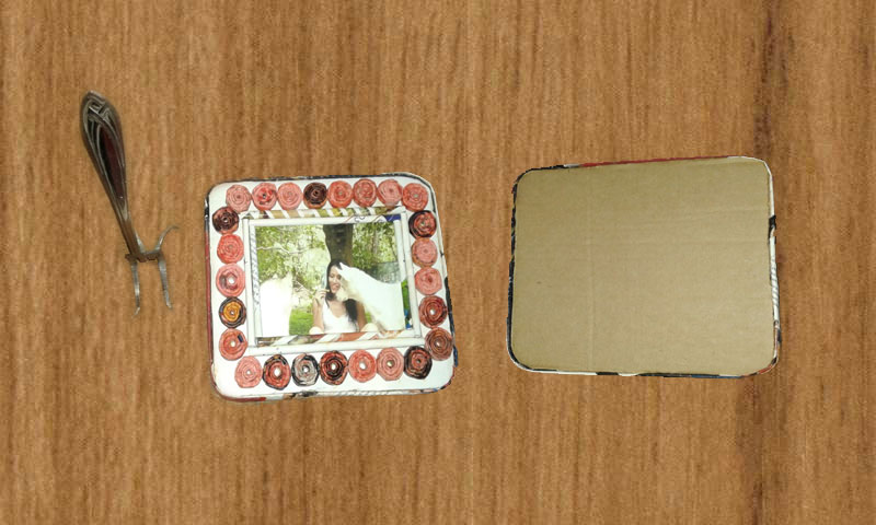 Pegamos la hoja blanca al cartón, luego pegamos la foto en el centro. Despues enmarcamos solo la foto con tubitos de papel, seguido pegamos los rollitos de papel, recortamos el excedente de cartón y revisamos que queden las medidas correctas ya sea en cuadrado o rectangular, finalizamos pegando tubitos de papel aplanados en los bordes.