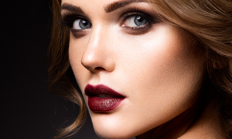 Close-up portrait of beautiful woman with bright make-up and dark red lips