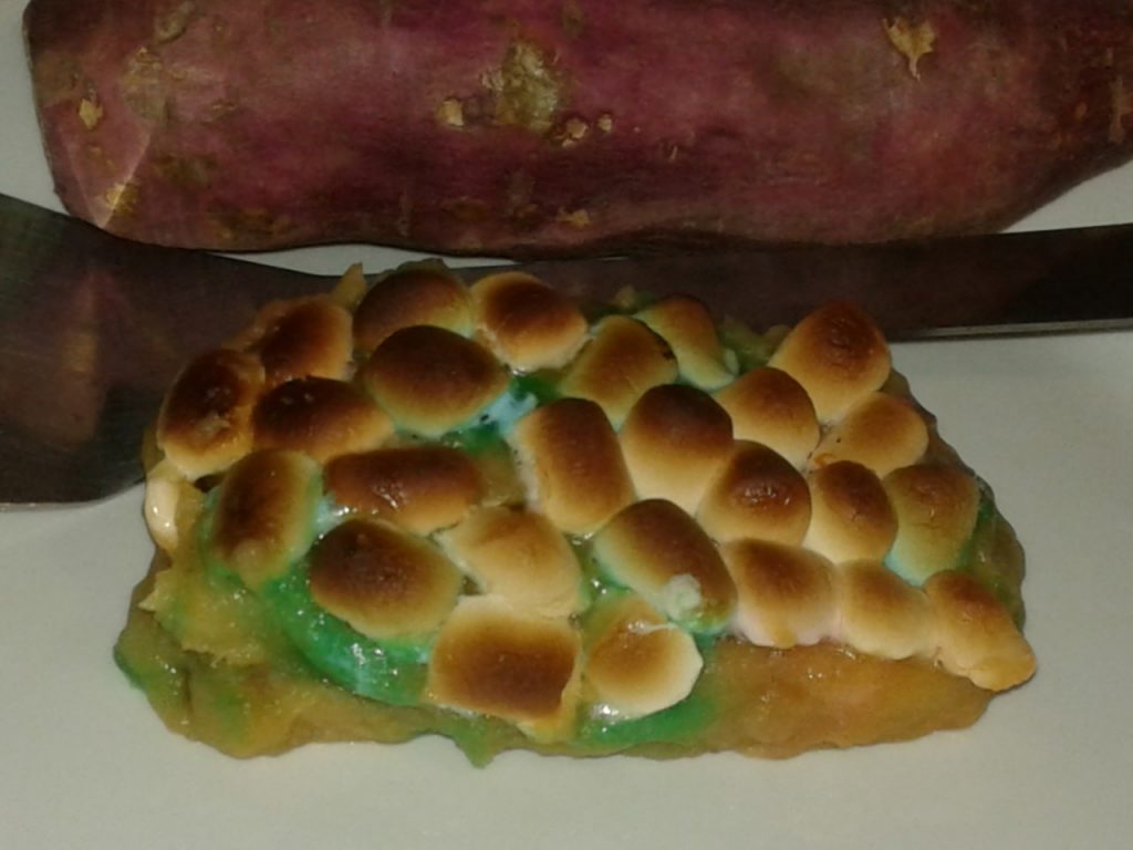 Calienta el horno a 350āF. Hacer el camote en pure y mezclar todos los ingredientes. Llevar la mezcla a un molde engrasado para horno y decorar con los marshmallows. Hornea los camotes durante 15 minutos o hasta que esté dorado.