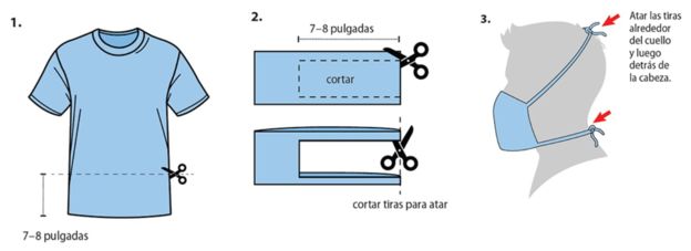 Otra opción, recomendada para un caso de apuro, es hacer una mascarilla con una camiseta de algodón que tenga más de 20 cm de ancho para hacer un corte de esa longitud (7 u 8 pulgadas).
