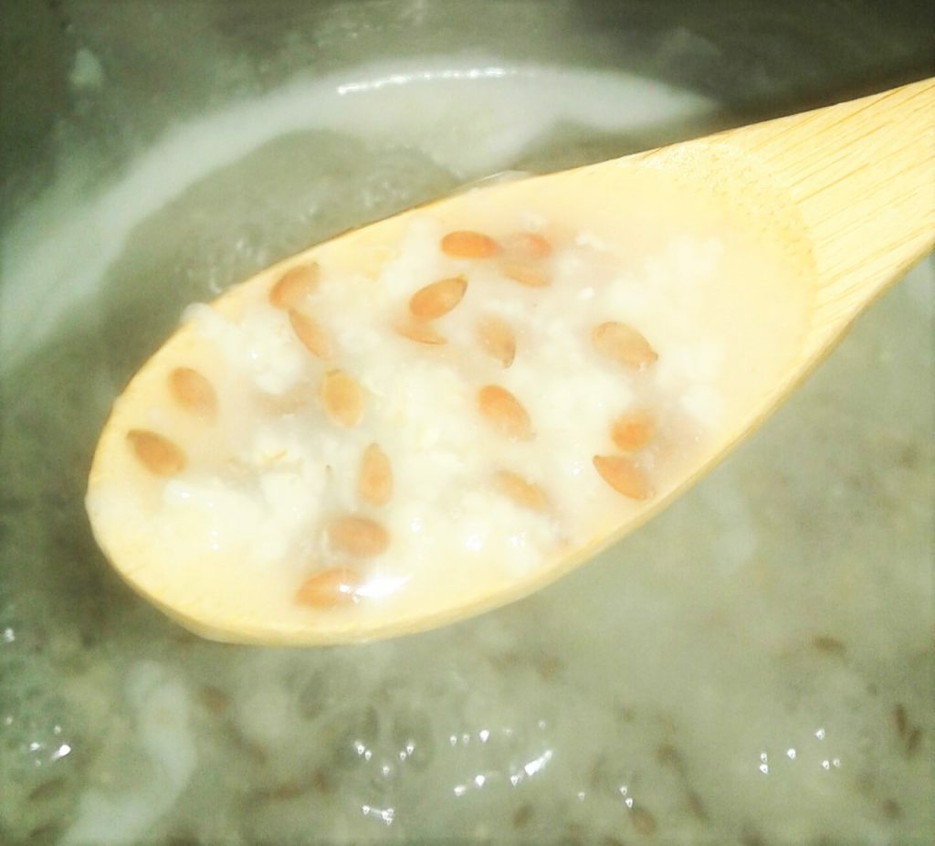 Para cantidades pequeñas vas a necesitar: 1 cucharada de linaza y 2 cucharadas de avena, cocinar en una taza de agua por 10 minutos y retirar del fuego cuando se obtiene una mezcla espesa.